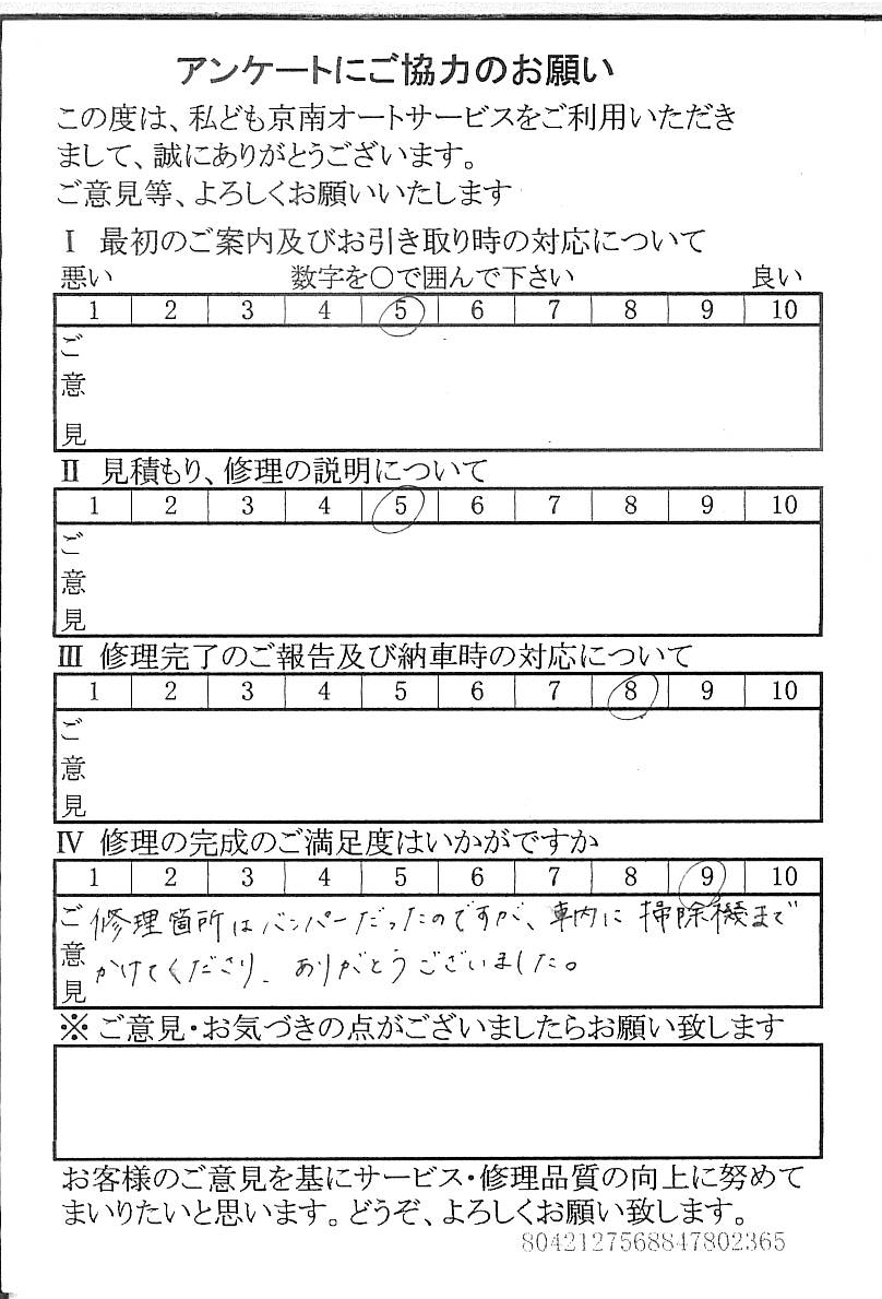 修理箇所はバンパーだったのですが、車内に掃除機までかけてくださり、ありがとうございました。